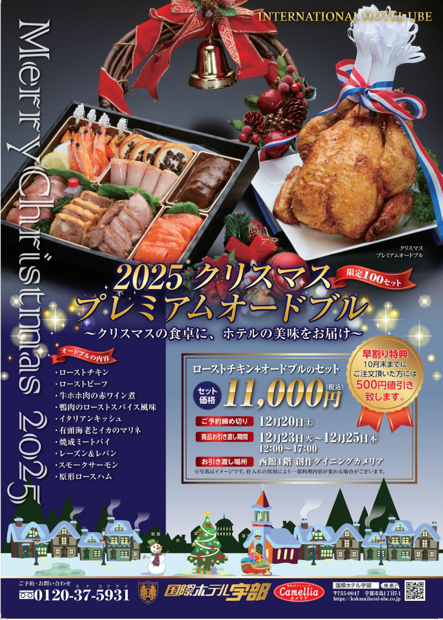 カジュアルな創作ダイニングレストラン「カメリア」(国際ホテル宇部)が、ホテルならではの本格洋食を詰め込んだオードブルをクリスマスの食卓にお届けします。
