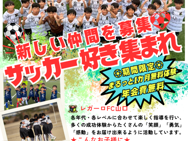 宇部や山口で活動するサッカークラブ「レガーロFC山口」が、新しい仲間を募集しています。\まるっと体験!11月15日まで/◎月会費5,500円~⇒お好きな日から1カ月間無料体験◎無料体験からの入会者は、最初の年会費無料・選手クラス基礎から応用...