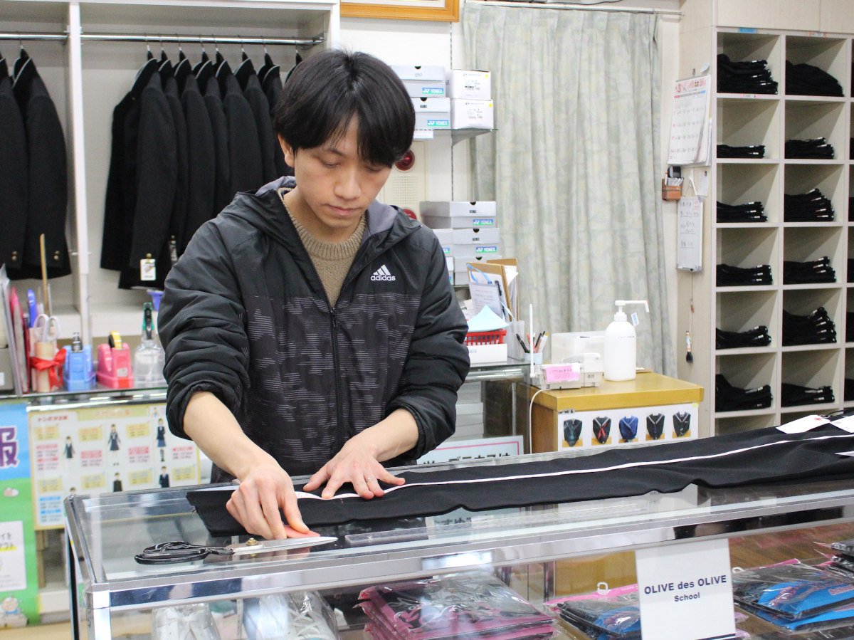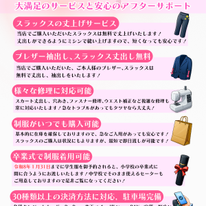 スラックスの裾上げやブレザーの袖出しも無料!さまざまな修繕など、急なトラブルにも対応可能なアフターサービスも充実!