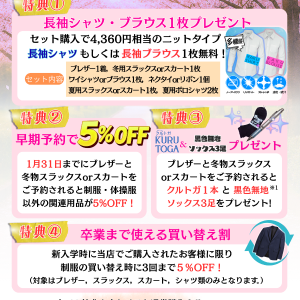 ◎早期予約で制服、体操服以外の関連用品5%OFF!(来年1月31日まで)
