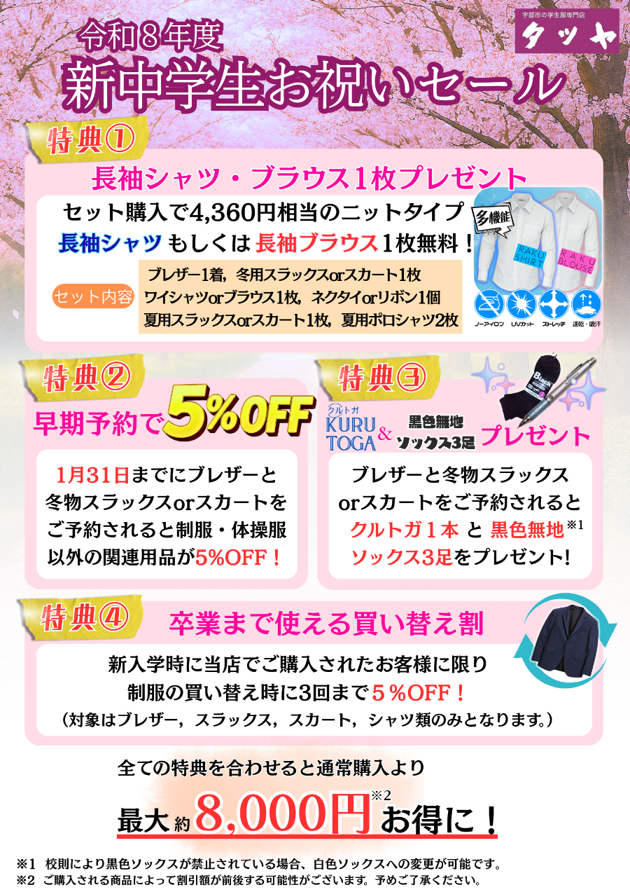 宇部の学生服専門店「タツヤ」で11月29日から、「新中学生お祝いセール」がスタートします!