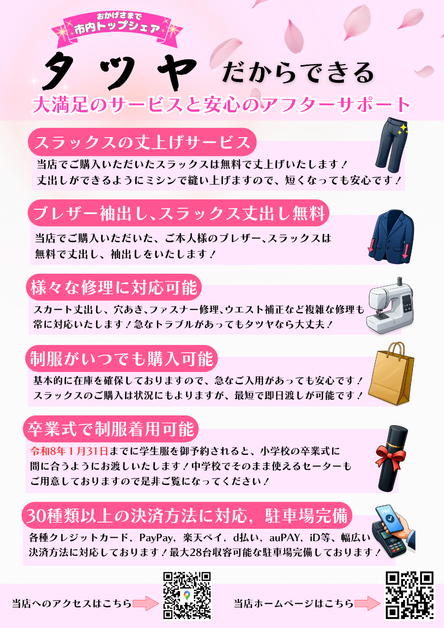 タツヤは、宇部市内中学校の統一型制服取扱店です。